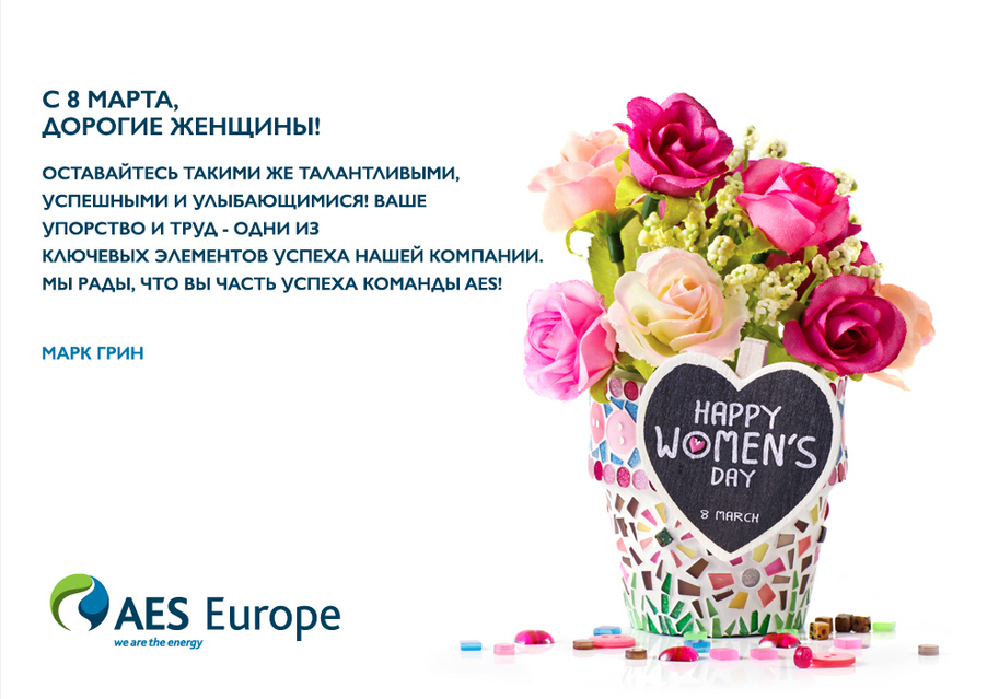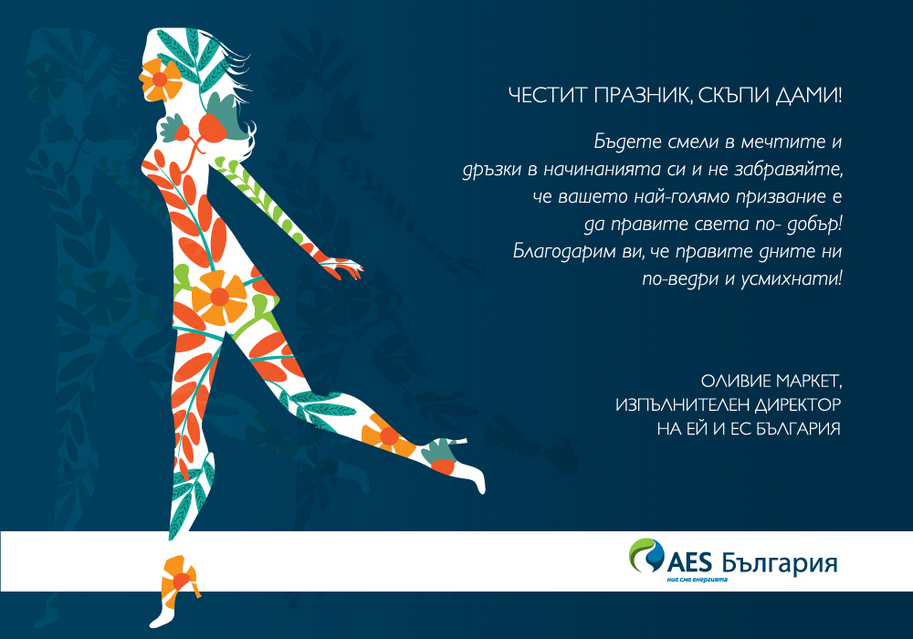 По случай Международния ден на жената, създадохме корпоративни поздравителни картички за офисите на AES в България и Казахстан.Трите красиви дизайна бяха разпратени до дамите в компанията и бяха допълнени с пожелания от изпълнителния директор за България Оливие Маркет и президента на бизнес-звено „Европа” Марк Грийн.