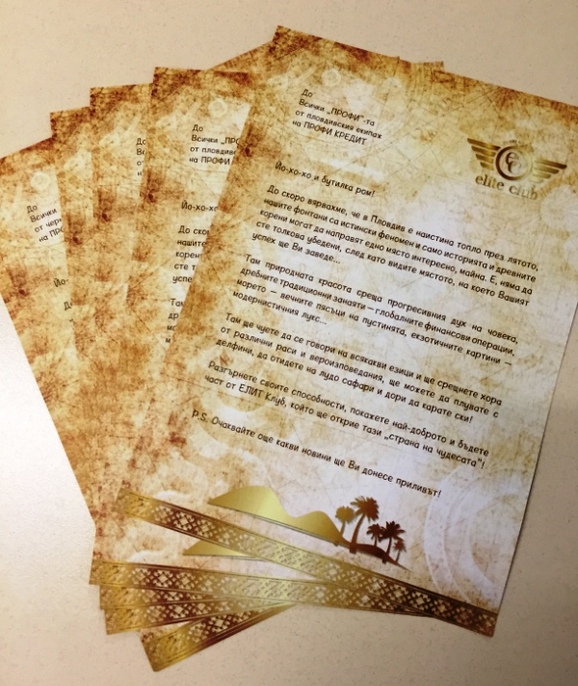 С оглед на дестинацията на пътуването (която все още се пази в тайна), екипът ни изпрати писмо в бутилка до всеки офис на Профи Кредит в страната. Текстовете на всяко писмо бяха персонализирани според спецификата на конкретния регион. По забавен начин те намекват, но не разкриват екзотичната дестинация на тазгодишното пътуване.