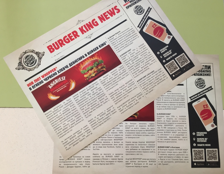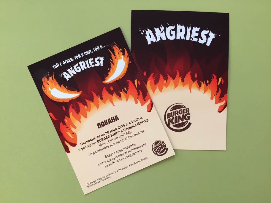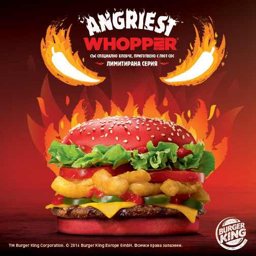 На 30 март 2016г. BURGER KING® изненадаха своите фенове със световната премиера на Angriest WHOPPER®. Новият бургер е с хрупкав “Angry” лук, пикантен сос и апетитни халапеньос, сирене „Чедър”, салата “Aйсберг” и свежи домати, добавени към сочното телешко. Голямата изненада е огнено червеното хлебче, изпечено със специалния лют сос.