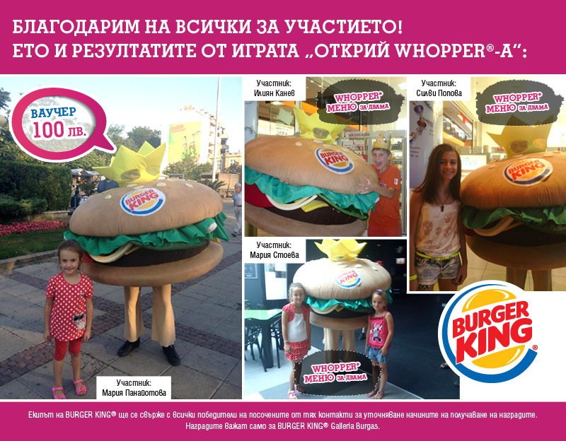 Промоутър, облечен като емблематичния бъргър Whopper®, може да бъде засечен на ключови места в гр. Бургас (в центъра на града, в Мол Галерия Бургас). Чрез поредица от фейсбук анонси съобщаваме местоположението на Whopper® днес. Участниците в играта трябва да го намерят, да се снимат с него и да качат снимката в специалното ни фейсбук приложение. Те могат да поканят свои приятели, които да ги подкрепят в надпреварата, като гласуват за тяхната снимка. Победителите са тези участници, чиито снимки съберат най-много гласове. Всички фейсбук потребители трябва да са харесали страницата на BURGER KING®, за да могат да участват или гласуват.