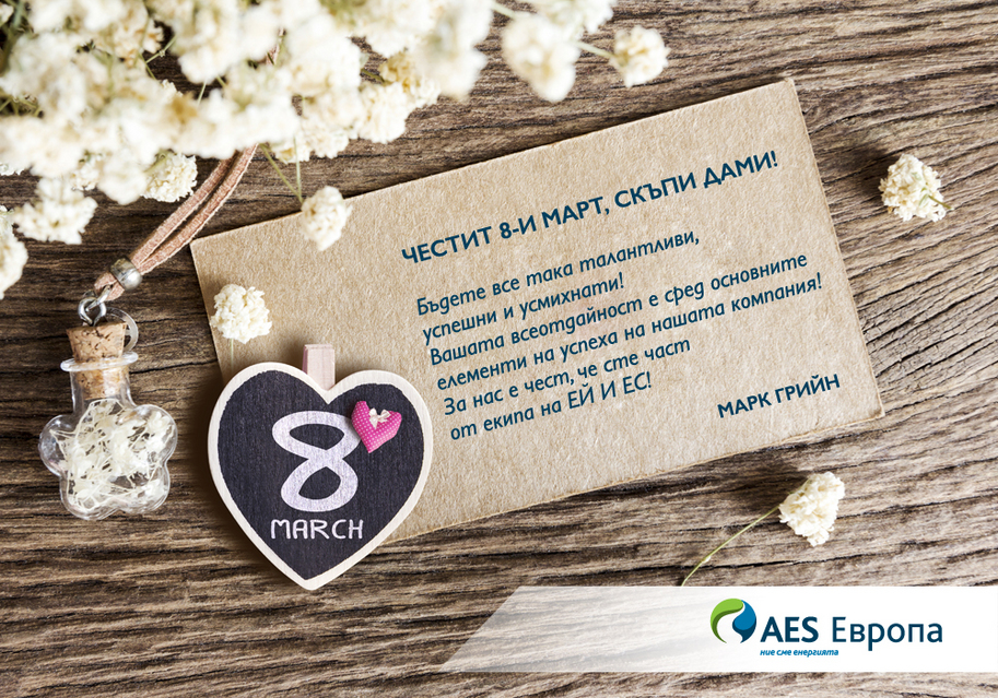 По случай Международния ден на жената, създадохме корпоративни поздравителни картички за офисите на AES в България и Казахстан.Трите красиви дизайна бяха разпратени до дамите в компанията и бяха допълнени с пожелания от изпълнителния директор за България Оливие Маркет и президента на бизнес-звено „Европа” Марк Грийн.