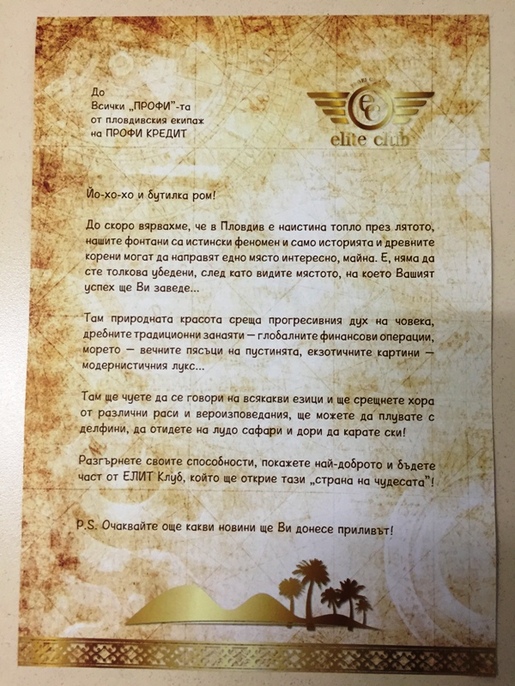 С оглед на дестинацията на пътуването (която все още се пази в тайна), екипът ни изпрати писмо в бутилка до всеки офис на Профи Кредит в страната. Текстовете на всяко писмо бяха персонализирани според спецификата на конкретния регион. По забавен начин те намекват, но не разкриват екзотичната дестинация на тазгодишното пътуване.