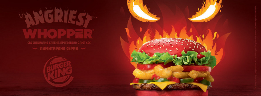 На 30 март 2016г. BURGER KING® изненадаха своите фенове със световната премиера на Angriest WHOPPER®. Новият бургер е с хрупкав “Angry” лук, пикантен сос и апетитни халапеньос, сирене „Чедър”, салата “Aйсберг” и свежи домати, добавени към сочното телешко. Голямата изненада е огнено червеното хлебче, изпечено със специалния лют сос.