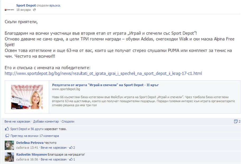 Потребителят трябва да “хареса” страницата на Sport Depot, за да има право на участие. В специализирано приложение всички участници попълват данните си и поставят в специално поле линк към желан от тях продукт от уеб сайта на Sport Depot. В края на всеки етап от играта се теглят чрез томбола 3-ма печеливши, които получават като награда точно продукта, който са си избрали. Заедно с тях още по 60 души получават по-малки, утешителни награди.