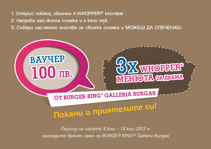 Промоутър, облечен като емблематичния бъргър Whopper®, може да бъде засечен на ключови места в гр. Бургас (в центъра на града, в Мол Галерия Бургас). Чрез поредица от фейсбук анонси съобщаваме местоположението на Whopper® днес. Участниците в играта трябва да го намерят, да се снимат с него и да качат снимката в специалното ни фейсбук приложение. Те могат да поканят свои приятели, които да ги подкрепят в надпреварата, като гласуват за тяхната снимка. Победителите са тези участници, чиито снимки съберат най-много гласове. Всички фейсбук потребители трябва да са харесали страницата на BURGER KING®, за да могат да участват или гласуват.